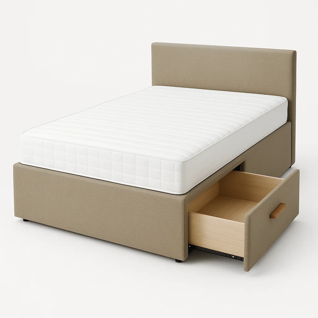 Letto contenitore imbottito in tessuto con cassetto e materasso